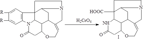 Уже в самом начале изучения строения стрихнина и бруцина была отмечена близость свойств этих оснований, которая в ряде случаев доходила до полной идентичности. Это навело исследователей на мысль, что бруцин является диметоксипроизводным стрихнина. Это предположение было подтверждено окислением хромовой кислотой в определенных условиях, при котором получался один и тот же продукт – т.н. кислота Ханссена (I) – продукт разрушения ароматического кольца алкалоидов (1).