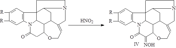 Стрихнин и бруцин дают бензилиденовые производные, реагируют с азотистой кислотой, давая изонитрозопроизводные (IV). Эти реакции доказывают наличие реакционноспособной метиленовой группы (1).
