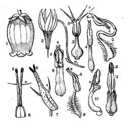 Цветки: 1 – хамедафна болотная (Chamaedaphne calyculata); 2 – клюква (Oxycoccus) Тычинки: 3 – зеновия припудренная (Zenobia pulverulenta); 4 – хамедафна болотная (Chamaedaphne calyculata); 5 – лиония кустарниковая (Lyonia fruticosa); 6 – черника тычиночная (Vaccinium stamineum); 7 – черника обыкновенная (Vaccinium myrtillis); 8 – эллиотия кистевидная (Elliotia racemosa); 9 – гаультерия лежачая (Gaultheria procumbens); 10 – пиерис пышноцветный (Pieris floribunda); 11 – оксидендрум древовидный (Oxydendrum arboretum): а- тычиночные придатки; б- поры.