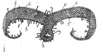 Рис.4 Поперечный срез листа багульника болотного (Ledum palustre): 1 – эпидерма; 2 – кутикула; 3 – кроющие волоски; 4 – железистые волоски; 5 – устьице; 6 – губчатый мезофилл; 7 – межклетники; 8 – закрытый коллатеральный проводящий пучок.