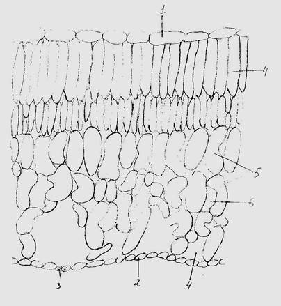 Рис.5. Поперечный срез листа голубики обыкновенной (V. Uliginosum L.): 1 – верхняя эпидерма; 2 – нижняя эпидерма; 3 – устьица; 4 – палисадный мезофилл; 5 – губчатый мезофилл; 6 – межклетники; 7 – воздухоносные полости.
