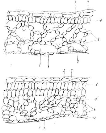 ● Мезофилл гетерогенный, четко дифференцирован на хорошо развитую палисадную ткань, как правило, двухслойную и губчатую;