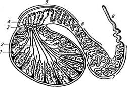 Рис.2. Схема строения семенника с придатком (разрез): 1 - извитые канальцы; 2 - прямые канальцы; 3 - сеть семенника; 4 - семявыносящие канальцы; 5 - головка; 6 - тело; 7 - хвост придатка семенника; 9 – спермиопровод