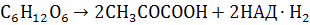Любое брожение протекает как бы в две стадии: первая - окислительная – включает превращение глюкозы до пировиноградной кислоты с образование двух молекул восстановленного НАД