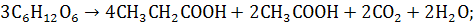 Пропионово–кислое брожение – это превращение сахара или молочной кислоты и ее солей в пропионовую и уксусную кислоты с выделением углекислого газа и воды: