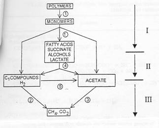 1-первичные бродильщики; 2-водородокисляющие метаногены; 3-ацетатпотребляющие метаногены; 4-вторичные бродильщики; 5-ацетогенные бактерии. (Schink,1997).