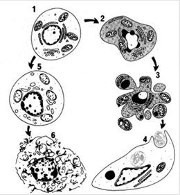 Рис.1. Последовательность ультраструктурных изменений при апоптозе (справа) и некрозе (слева): 1 - нормальная клетка; 2 - начало апоптоза; 3 - фрагментация апоптотической клетки; 4 - фагоцитоз апоптотических телец окружающими клетками; 5 - гибель внутриклеточных структур при некрозе; 6 - разрушение клеточной мембраны.