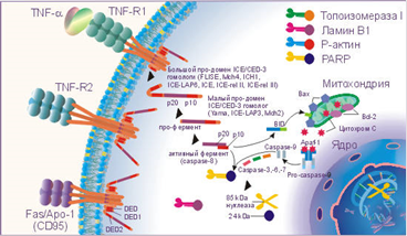 TNF-α и Fas-лиганд (CD178) запускают каскад биохимических реакций, финальным этапом которых является дефрагментация хромосом и гибель клетки. На поверхности клеток организма имеются специальные рецепторы для TNF-α, это TNF-RI (с молекулярной массой 55-60 кДа) и TNF-RII (с молекулярной массой 75-80 кДа), а для Fas-лиганда рецептор Fas / APO-1 (CD95).