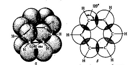 Исследование бензола с применением новейших методов указывает на то, что в его молекуле между углеродными атомами нет ни обычных простых, ни обычных двойных связей. Например, изучение ароматических соединений при помощи лучей Рентгена показало, что 6 атомов углерода в бензоле, образующие цикл, лежат в одной плоскости в вершинах правильного шестиугольника и центры их находятся на равных расстояниях друг от друга, составляющих 1,40 А. Эти расстояния меньше, чем расстояния между центрами углеродных атомов, соединенных простой связью (1,54 А), и больше, чем м. соединенными двойной связью (1,34 А). Таким образом, в бензоле углеродные атомы соединены при помощи особых, равноценных между собой связей, которые были названы ароматическими связями. По природе своей они отличаются от двойных и простых связей; наличие их и обуславливает характерные свойства бензола. С точки зрения современных электронных представлений природу ароматических связей объясняют следующим образом.