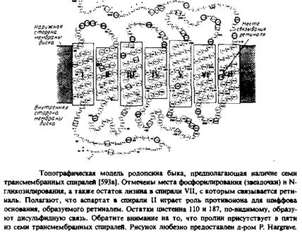 Еще один белок, для которого получены непротиворечивые топографические данные, — это бычий родопсин. В этом случае анализ первичной структуры тоже предполагает наличие семи трансмембранных а-спиралей с соединяющими их петлями. С такой моделью согласуются результаты изучения топографии с помощью антител и протеаз, а также данные о локализации мест фосфорилирования и присоединения углеводов. Обратите внимание, что хотя бактериородопсин и родопсин связывают одну и ту же простетическую группу — ретиналь — и, по-видимому, уложены в мембране одинаковым образом, никакой гомологии в их аминокислотной последовательности не наблюдается и выполняют они разные функции. Бактериородопсин является бактериальным светочувствительным протонным насосом, а родопсин — это зрительный пигмент, содержащийся в палочках сетчатки. Под действием света родопсин претерпевает светозависимые конформационные изменения, инициируя целый каскад событий, конечным результатом которых является зрительный сигнал.