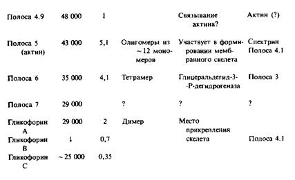 Наиболее детально изучены мембрана и цитоскелет эритроцитов млекопитающих. В табл. 4.2 перечислены основные белки, которые были разделены с помощью ДСН-ПААГ-электрофореза. Цифровые обозначения полипептидов связаны с их относительной электрофоретической подвижностью в геле. При промывании мембраны растворами с низкой ионной силой удаляются периферические мембранные белки, к которым прежде всего относятся компоненты цитоскелета. Основными интегральными белками цитоскелета являются белок полосы 3 и гликофорины А, В и С. Белок полосы 3 представляет собой анионный переносчик, а функции гли-кофоринов, относящихся к классу гликопротеинов, неизвестны. В электронном микроскопе цитоскелет выглядит как упорядоченная сеть на внутренней стороне мембраны. Как видно из табл. 4.2, белки цитоскелета являются основными мембранными компонентами, и это облегчает их биохимическую характеристику. По сути белковый каркас состоит из спектрин-актинового комплекса, который связан с плазматической мембраной благодаря взаимодействиям как с белком полосы 3, так и с гликофорином; эти взаимодействия осуществляются с помощью специальных белков — ан-