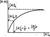 Эта зависимость является аналогом изотермы адсорбции Лэнгмюра в теории адсорбции или уравнения Михаэлиса-Ментеи в ферментативной кинетике. Из выражения следует, что при предельных значениях концентрации 0 концентрация комплекса стремится к общей концентрации центров связывания 0. Для вычисления К определяют концентрацию антигена 'о, при которой половина антител находится в виде комплекса с антигеном. С учетом выражений и можно получить
