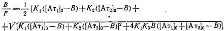С использованием полученных значений строят теоретическую зависимость B/F от В, сравнивают ее с экспериментальной и подбирают новые оценочные параметры до наилучшего совпадения теоретической и экспериментальной кривой.