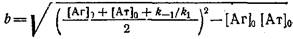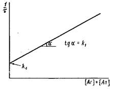 Откладывая графически k' от концентрации 0,получаем прямую, тангенс угла наклона которой дает ki, а отрезок, отсекаемый на оси ординат, k-i. Данный способ расчета пригоден, когда k-\ сравнима с &i0. В противном случае что позволяет определить по тангенсу угла наклона только бимолекулярную константу скорости Бй.