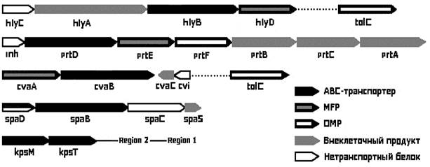 Как правило, гены, кодирующие все три компонента системы, организованы в один оперон, обычно вместе с генами, кодирующими секретируемый белок. К примеру, гены, кодирующие четыре сходных по строению металлопротеазы E. chrysanthemi: PrtA (50кДа), PrtB (53 кДа), PrtC (55 кДа), PrtG (58 кДа) организованы в один оперон с генами, кодирующими все три компонента системы их секреции: PrtD (ABC-транспортер), PrtE (MFP), PrtF (OMP). В случае с E. coli, ген hlyA, кодирующий α-гемолизин, объединен с генами hlyB и hlyD, кодирующими соответственно ABC-транспортер и MFP. Так же дело обстоит и у S. marcescens. Ген hasA, кодирующий внеклеточный гемопротеин, организован в один оперон с генами hsaD (ABC-транспортер) и hasE (MFP). В этих двух случаях ген, кодирующий OMP, в единый оперон не включается и содержится отдельно. Кроме того, у S. marcescens обнаружен оперон, содержащий только гены, которые детерминируют компоненты системы секреции и ни одного гена, ответственного за синтез экспортных белков. Он содержит три гена: lipB (ABC-транспортер), lipC (MFP), lipD (OMP) (H. Akatsuka et al., 1998). Был выявлен также ряд оперонов, которые содержат гены, не относящиеся ни к системе секреции, ни являющиеся генами секретируемых белков. Эти гены кодируют белки, которые тем или иным образом выполняют регуляторную функцию (M. Fath еt al., 1993).