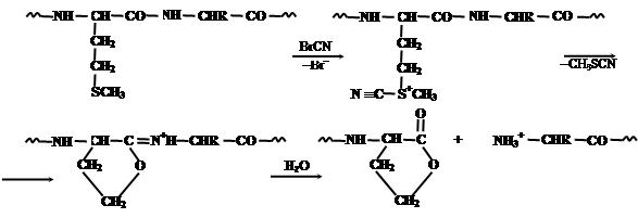 Наряду с ферментативными методами используются и химические методы расщепления белков. Для этой цели часто применяют бромциан, расщепляющий белок по остаткам метионина:
