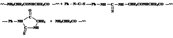 В результате образуется фенилтиогидантоин, содержащий боковой радикал аминокислоты R1, который может быть идентифицирован путем измерения какой-либо физической или физико-химической характеристики, позволяющей различать гидантоины, соответствующие разным входящим в состав белков аминокислотам. В качестве такой характеристики может служить хроматографическая подвижность в какой-либо предварительно проградуированной по стандартным образцам гидантоинов системе или молекулярная масса, определяемая с помощью масс-спектрометра.