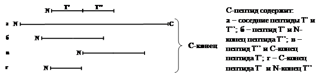 Если установлена структура всех полипептидов, полученных расщеплением исследуемого белка с помощью трипсина (далее такие полипептиды обозначаются буквой Т - от слова “трипсиновые”), то остается определить для каждого из этих пептидов, с какими двумя Т-пептидами он соседствует с N- и С-конца. В структуре просеквенированных Т-пептидов такая информация полностью отсутствует. Однако ее можно частично, а в ряде случаев и полностью восстановить, если располагать аналогичными данными для серии полипептидов, полученных расщеплением того же исследуемого белка по какой-либо другой группе аминокислотных остатков. Для определенности ниже речь будет идти о полипептидах, полученных расщеплением химотрипсином (пептиды группы С, chymotryptic).
