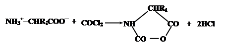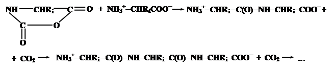 Эти соединения содержат электрофильную ангидридную группу, которая может атаковать алифатическую аминогруппу аминокислоты, используемой в качестве затравки, с выделением СО2 и одновременном освобождением новой аминогруппы из атакующей молекулы N-карбоксиангидрида, таким образом открывая возможность поликонденсации: