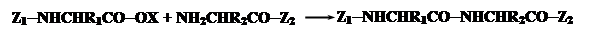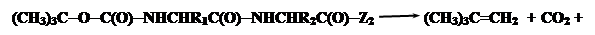 Должна приводить к одному определенному дипипептиду. Этот пептид нереакционноспособен и для продолжения процесса необходимо удалить одну из защитных групп Z1,Z2, для того чтобы открыть либо NH2, либо СООН-группу для следующей стадии удлинения пептидной цепи. Поэтому главным требованием к защитным группам является возможность их мягкого селективного удаления, не повреждающего пептидную связь. Наиболее широко для защиты a-аминогрупп используется трет-бутилоксикарбонильная группа (Вос), которую легко ввести в аминогруппу обработкой аминокислоты соответствующим N-гидроксисукциниимидным эфиром: