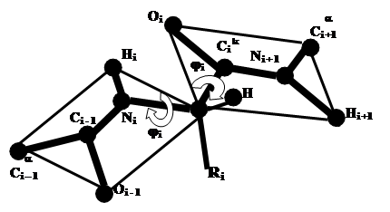 Пептидная связь вследствие p, p-сопряжения p-связи карбонильной группы и р-орбитали атома N, на котором находится не поделенная пара электронов, не может рассматриваться как одинарная и вращение вокруг нее практически отсутствует. По этой же причине хиральный атом C a и карбонильный атом C k любого i-го аминокислотного остатка пептидной цепи и атомы N и Сa(i+1)-го остатка находятся в одной плоскости. В этой же плоскости находятся карбонильный атом О и амидный атом Н ( однако накопленный при изучении структуры белков материал показывает, что это утверждение не совсем строго: атомы, связанные с пептидным атомом азота, находятся не в одной плоскости с ним, а образуют трехгранную пирамиду с углами между связями, очень близкими к 120°. Поэтому между плоскостями, образованными атомами Cia, Cik, Oi и Ni+1, Hi+1, Ci+1a , существует некоторый угол, отличающийся от 0°. Но, как правило, он не превышает 1° и не играет особой роли). Поэтому геометрически полипептидную цепочку можно рассматривать как образованную такими плоскими фрагментами, содержащими каждый по шесть атомов. Взаимное расположение этих фрагментов, как и всякое взаимное расположение двух плоскостей, должно определятся двумя углами. В качестве таковых принято брать торсионные углы, характеризующие вращения вокруг s-связей N ¾ C a и C a ¾ C k.