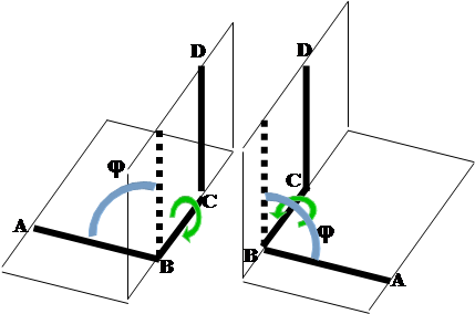 В такой системе возможен случай, когда связи А-В и С-D расположены параллельно и находятся по одну сторону от связи В-С. Если рассматривать эту систему вдоль связи В-С, то связь А-В как бы заслоняет связь C-D, поэтому такая конформация называется заслоненной. Согласно рекомендациям международных союзов химии IUPAC (International Union of Pure and Applied Chemistry) и IUB (International Union of Biochemistry), угол между плоскостями ABC и BCD считается положительным, если для приведения конформации в заслоненное состояние путем поворота на угол не выше 180° ближнюю к наблюдателю связь нужно поворачивать по часовой стрелке. Если эту связь для получения заслоненной конформации нужно поворачивать против часовой стрелки, то угол считается отрицательным. Можно заметить, что это определение не зависит от того, какая из связей находится ближе к наблюдателю.