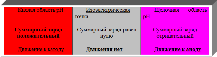 Эти же группировки имеют и электрические заряды, формирующие общий заряд белковой молекулы. В белках, где преобладают аспарагиновая и глутаминовая аминокислоты, заряд белка будет отрицательным, избыток основных аминокислот придает положительный заряд белковой молекуле. Вследствие этого в электрическом поле белки будут передвигаться к катоду или аноду в зависимости от величины их общего заряда. Так, в щелочной среде (рН 7 – 14) белок отдает протон и заряжается отрицательно, тогда как в кислой среде (рН 1 – 7) подавляется диссоциация кислотных групп и белок становится катионом.