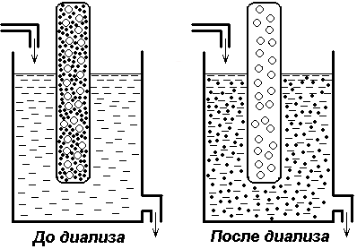 Диализ (белые крупные кружки – молекулы белка, черные – молекулы хлористого натрия)