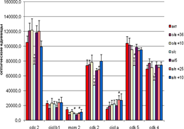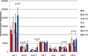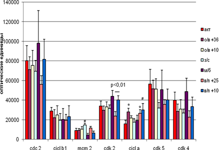 Уровень экспрессии циклина А достоверно повышался при вхождении в спячку при температуре +36˚С и при выходе из неё при температуре +25˚С, на уровне тенденции – при пробуждении при температуре +10˚С. Достоверным является различие в экспрессии Cdk 2 в группе выхода из спячки при разных температурных режимах (при температуре +25˚С – уменьшалась, а при +10˚С - увеличивалась ). Различия наблюдаются только внутри группы и отсутствуют при сравнении с активными и межбаутными. Хотя при низкой температуре тела во время выхода выхода из спячки экспрессия некоторых белков в основном повышается!