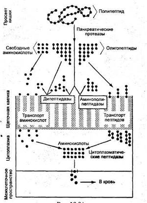Процесс переваривания и всасывания белков можно представить в следующем виде. В просвете кишки происходит расщепление полипептидов до олигопептидов, ди- и трипептидов и аминокислот. В мембране микроворсинок щеточной каймы — дальнейшее расщепление специфическими пептидазами, поглощение аминокислот и олигопептидов. В цитоплазме — расщепление ди- и олигопептидов цитоплазматическими пептидазами до аминокислот. В базальной мембране — выход аминокислот из клетки в кровь.