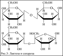 Из тех глюкозных остатков, которые в молекуле крахмала соединены 1,6-гликозидной связью, образуется дисахарид изомальтоза. Кроме того, с пищей в организм поступают дисахариды сахароза и лактоза (рис.3), которые гидролизуются специфическими гликозидазами – мальтазой, изомальтазой, лактазой и сахаразой соответственно.