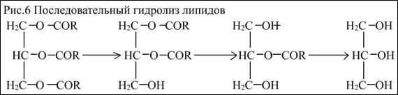 Под действием липазы идёт гидролиз жиров, в ходе которого жирные кислоты отщепляются от триацилглицерина одна за другой, сначала от α-углеродных атомов, потом – от β-углеродного атома (Рис. 6)