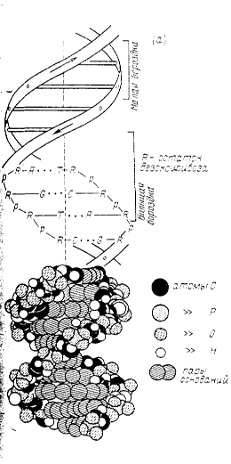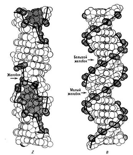 В настоящее время описаны три формы структуры ДНК: А-, В- и Z-формы (рис.4). Параметры модели Уотсона—Крика соответствуют конформации ДНК в физиологических условиях (В-форме ДНК). Однако при изменении условий среды двойная спираль может принимать другие формы. Так при уменьшении влажности (в препарате образца для рентгеноструктурного анализа) ДНК переходит в А-форму. Этот переход связан с изменением конформации в остатках дезоксирибозы, уменьшением расстояния между фосфатными группами сахарофосфатного остова. Расстояние между парами нуклеотидов вдоль оси спирали, равное 0,34 нм в уотсон-криковской модели, уменьшается (примерно до 0,25 нм при 11 нуклеотидных остатках на один виток спирали). Диаметр спирали увеличивается; изменяются ширина и глубина бороздок; комплементарные пары азотистых оснований образуют с осью спирали угол 20° и, главное, они смещаются к периферии спирали. Поэтому двойная спираль похожа на пологую винтовую лестницу и внутри нее возникает полость диаметром 0,40 нм.