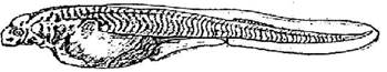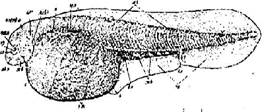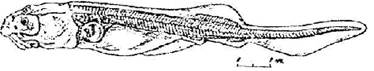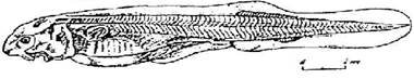 Стадия 39 - желудок отделен от кишечника; обособились спинной и анальные плавники (рис. 40). Боковая линия сейсмосенсорной системы достигает уровня заднего грудного плавника; появляется добавочный ряд сейсмосенсорной системы.