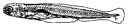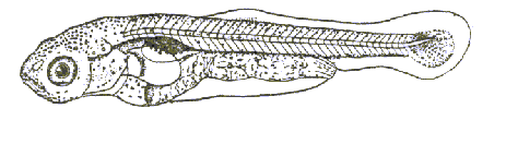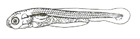 Этап второй (С1) –личинка размером 8,9-9,7 мм. Длительность этапа 4 суток. Желточный мешок полностью рассасывается и личинка переходит на экзогенное питание. Рот конечный. Закладываются хрящевые нижние дужки позвонков, продолжается формирование липидотрихий (рис. 4.). Питаются одноклеточными водорослями, коловратками, инфузориями, молодью кладоцер и копепод.