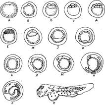 Примечание: А – неоплодотворенная икринка; Б – набухшая икринка с образовавшимся зародышевым диском; В – стадия двух бластомеров; Г – стадия четырех бластомеров; Д – стадия 8 бластомеров; Е – стадия крупноклеточной морулы; Ж – стадия бластулы; З – стадия бластодерма охватывает половину желтка; И – стадия появления зародышевого валика; К – стадия образования первых сомитов в туловище; Л – образование глазных пузырей; М – формирование слуховых плакод; Н – формирование хрусталиков; О – начало пигментации; П – только что выклюнувшаяся личинка.