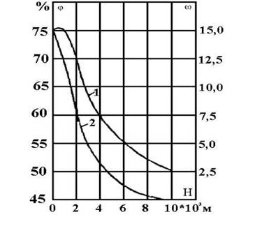 Рисунок 3 — Зависимость относительной (1) и абсолютной (2) влажности воздуха от высоты над уровнем моря: