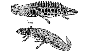 Рис. 5. Обычный (сверху) и неотенический (снизу) самцы обыкновенного тритона (Triturus vulgaris lantv)