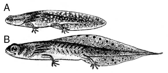 Рис.6. Личинки: А – обыкновенного тритона, Triturus vulgaris lantv, В – гребенчатого тритона, Triturus cristatus.