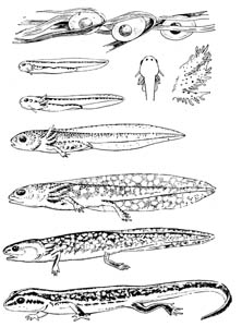 1 – яйцо; 2 – личинка в момент выклева; 2а – передняя часть той же личинки снизу; 3 – стадия прорыва ротового отверстия наружных жабр; 4 – стадия полного отверстия наружных жабр и расчленения передних конечностей; 4а – детали строения наружных жабр; 5 – стадия расчленения передних и задних конечностей; 6 – начало редукции жабр и плавниковых складок; 7 – стадия выхода на сушу.