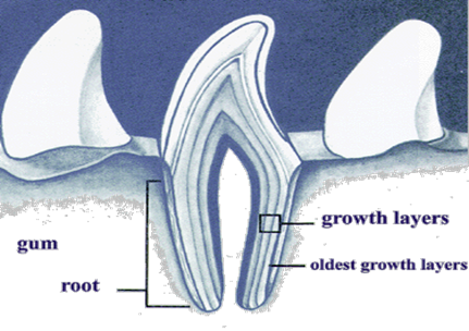 Зубы крепкие, наверху 8-12 пар, внизу 10-13 пар, диаметром у десны 6-7 мм, в корне 10 мм.