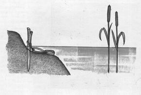 При капканном промысле на вылазах у жилых и кормовых хаток, кормовых столиках, у выхода в нору и переходах. Капканы №1 и №0 устанавливают на откосе берега обязательно в воду, которая должна покрывать тарелочку на 1,5-2 пальца, то есть с расчётом захвата зверька за заднюю ногу. Необходимо, чтобы ондатра, попавшая в капкан, могла прыгнуть в воду и сразу затонуть, иначе на сухом или мелководном месте всегда есть возможность откручивания лапки (особенно передней) и уход зверька. Соответственно этому подбирают длину поводка, лучший материал для которого- цепь или оставленная из 3-4 колен мягкая проволока длиной 60-100 см, позволяющие зверьку прыгнуть в воду. Поводок крепят к колышку (рисунок 10).