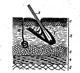 Рисунок 13– Схема строения кожного покрова: 1-эпидермис; 2-дерма; 3-подкожно-жировой слой; 5-подкожная клетчатка; 6-сумка волоса; 7-корень волоса; 8-стержень волоса; 9-сальная железа; 10-потовая железа; 11-мышца, поднимающая волос.