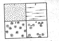 Рисунок 15- Расположение волос на коже зверей: 1-одиночное; 2-простыми группами; 3-пучками; 4-сложными группами.