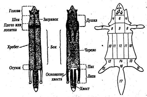 В пушном товароведении участки шкуры имеют специальные наименования (рисунок 17): чрево-брюшной участок находится от основания передних лап до паховой области;
