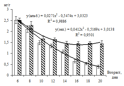 Данные, полученные в экспериментах с использованием альбиносных и зеленых растений, показывают, что ингибирование биосинтеза основных фотосинтетических пигментов не затрагивает биосинтез антоцианов в первые дни культивирования (6 – 10 дней). Показано одновременное снижение содержания антоцианов как в альбиносных, так и в зеленых проростках ячменя обыкновенного. В дальнейшем, начиная с 10 – 12-го дня, разница в содержании антоцианов у различно пигментированных растений становилась более заметной и статистически достоверной, достигая максимума к 20-му дню.