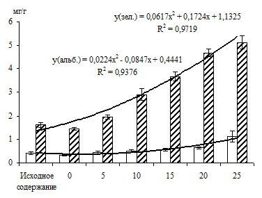 Обнаружено более резкое снижение содержания антоцианинов в альбиносных проростках по сравнению с зелеными аналогами: содержание данных пигментов в зеленых листьях ячменя обыкновенного превосходило в 2,9 раза аналогичный уровень в альбиносах (рис. 1).