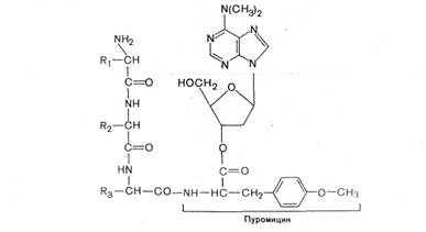 Одним из мощных ингибиторов белкового синтеза является пуромицин. В результате структурного сходства с концевым остатком АМФ в аминоацил-тРНК' он легко взаимодействует с А-участком пептидил-тРНК с образованием пептидил-пуро-мицина.