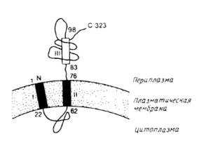 Аминокислотные остатки пронумерованы. Прямоугольниками обозначены гидрофобные сегменты. Первый гидрофобный участок не был обнаружен экспериментально, вывод о его существовании был сделан исходя из его гидрофобности. Наличие и ориентация второго гидрофобного участка установлены экспериментально и, по-видимому, он функционирует как внутренняя сигнальная последовательность. Третий гидрофобный сегмент имеет слабо выраженный гидрофобный характер и является частью периплазматического домена.