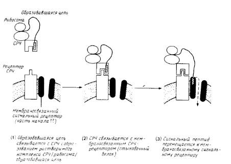 Сигнал-распознающая частица и СРЧ-рецептор (стыковой белок) хорошо охарактеризованы. Мембраносвязывающий сигнальный рецептор изображен как компонент канала через мембрану, но существование таких каналов и роль сигнального рецептора не бесспорны. После образования комплекса между сигнальным пептидом и мембраносвязанным рецептором на стадии 3 СРЧ и стыковочный белок могут диссоциировать и принимать участие в новом цикле, оставляя мембраносвязанную рибосому и образовавшуюся цепь присоединенными к аппарату переноса.
